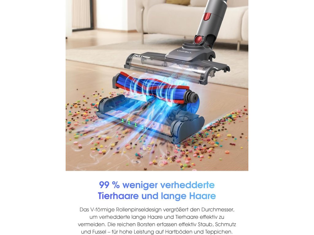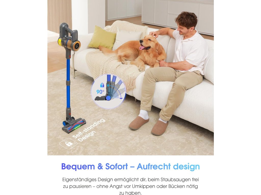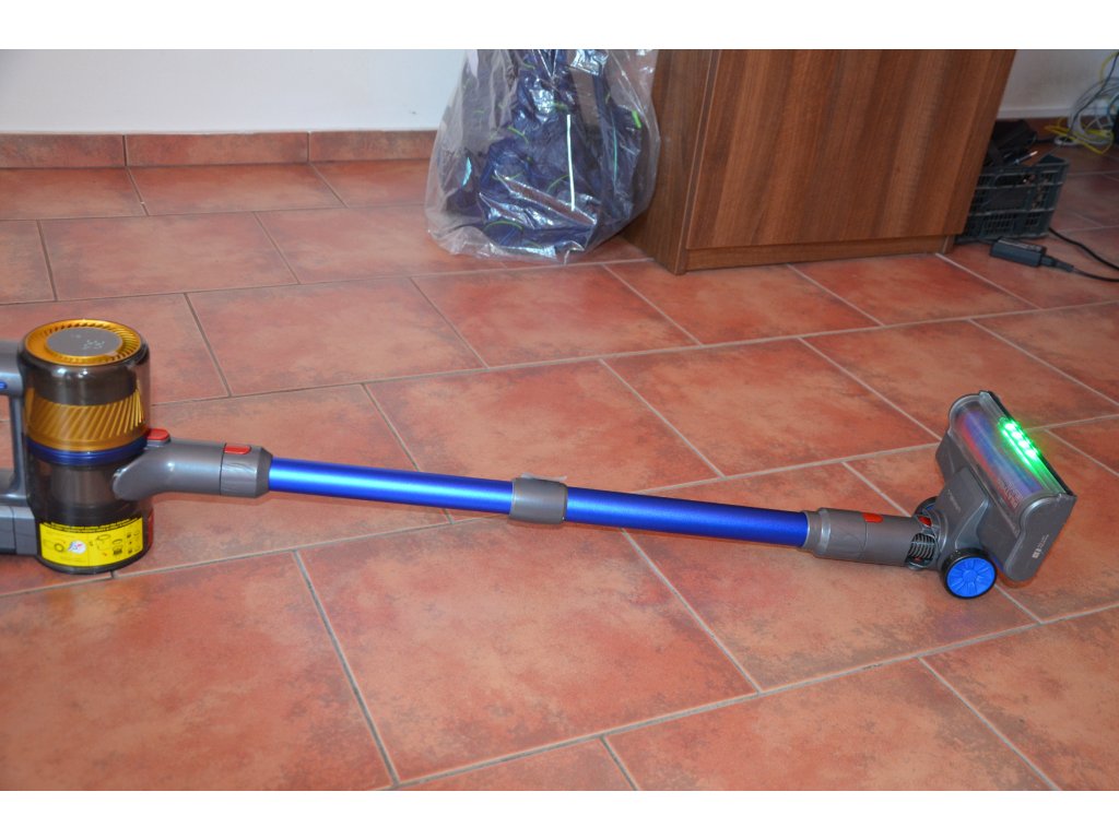 • Tento vysavač je vybaven 450W bezkartáčovým motorem s sací silou až 45 KPa, který dokáže během jedné sekundy vysávat velké prachové částice, zvířecí chlupy, vlasy, drobky z sušenek a prach ve štěrbinách. Sací výkon lze nastavit stisknutím tlačítka ve třech stupních.