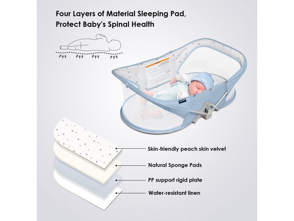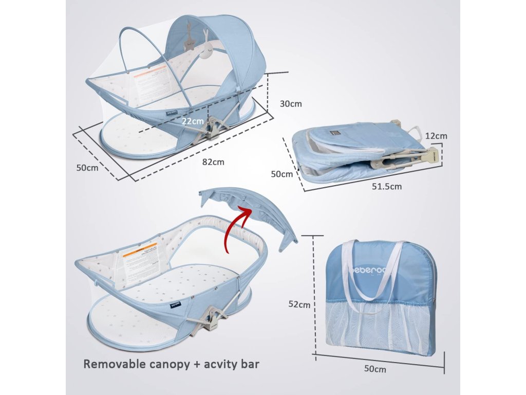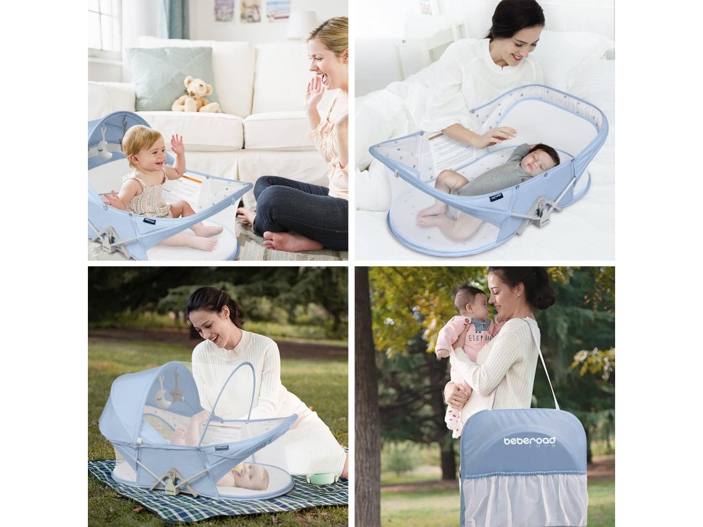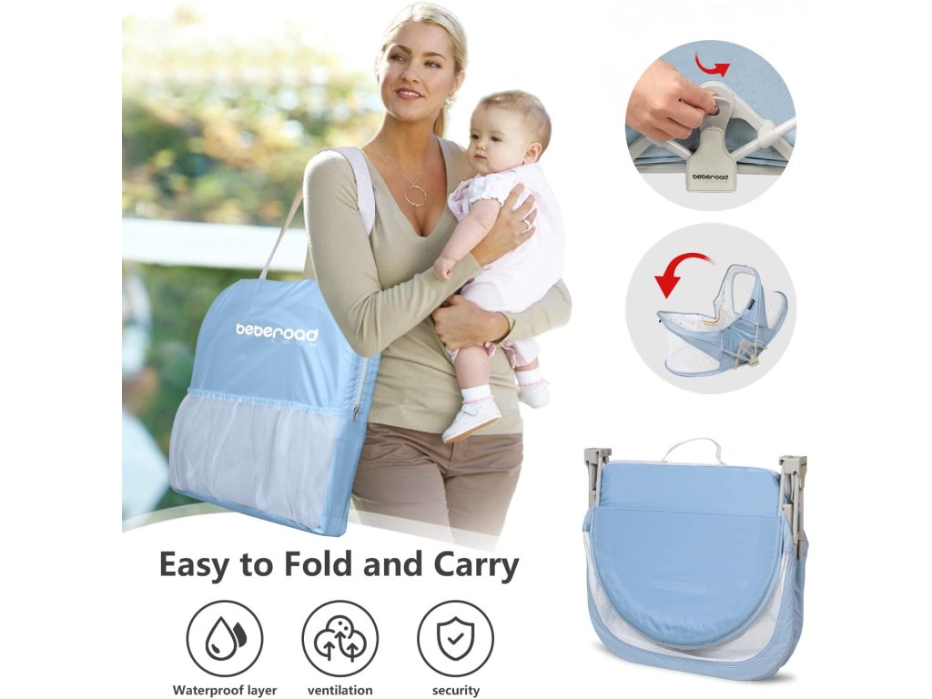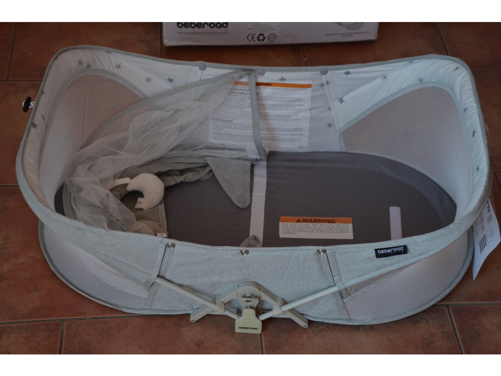 Prodám novou dětskou cestovní postýlku Beberoad. Přenosná cestovní postýlka pro děti, dvoubodový bezpečnostní T-lockový systém – s kapucí proti komárům, matrací a taškou – prodyšná síť.