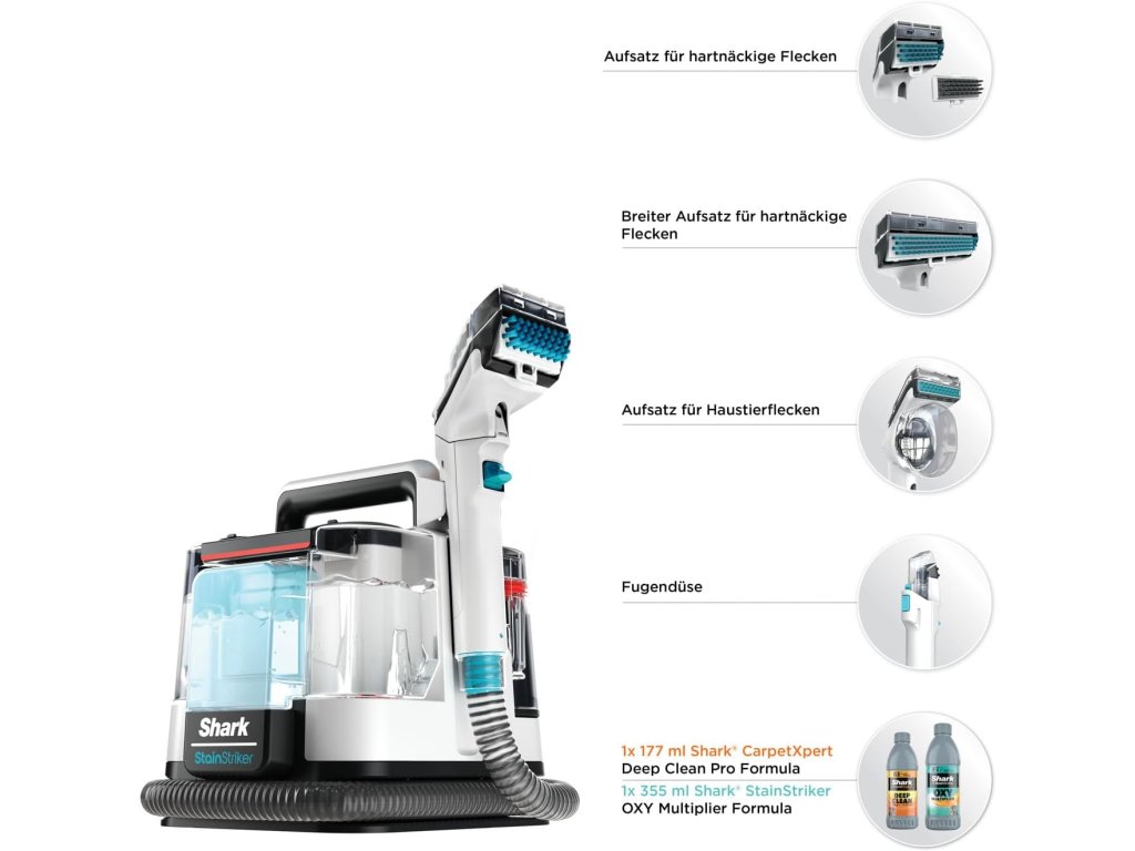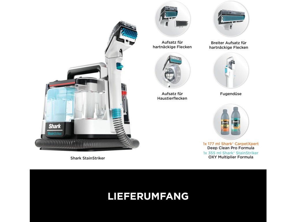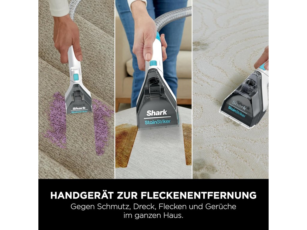 • SHARK Silná sací síla: Vysokotlaký sprej čistí hluboko do vláken. Silná sací síla vysává nečistoty a tekutinu a rychle schne. Odstraňuje rozlité nápoje, skvrny od domácích zvířat, pachy, uložené bláto a nečistoty