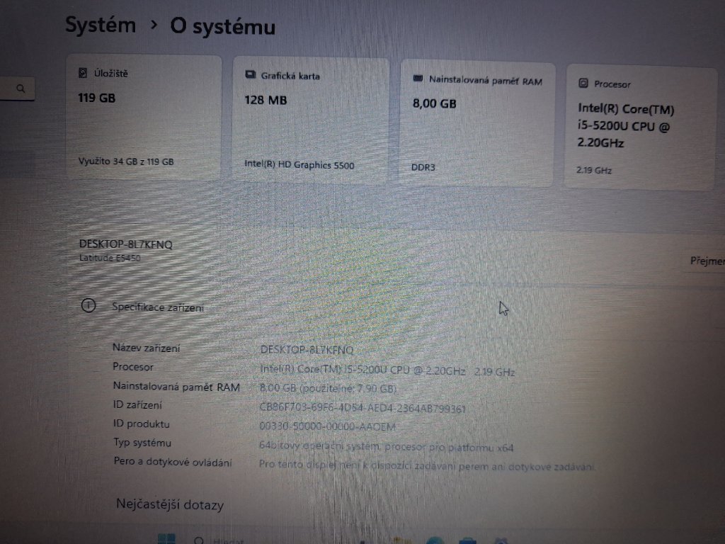 Nabízím k prodeji notebook Dell latitude E5450. Notebook je zachovalý a svižný. Hlavní výhodou tohoto notebooku je výkonný procesor Intel Core i5, paměť 8GB a rychlý SSD disk 128GB. Dlouhá výdrž baterie viz foto. Na notebook poskytnu doklad o koupi a 2 měsíce záruku.