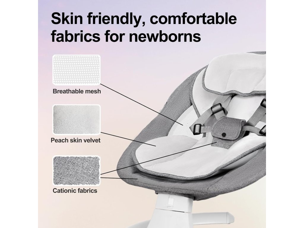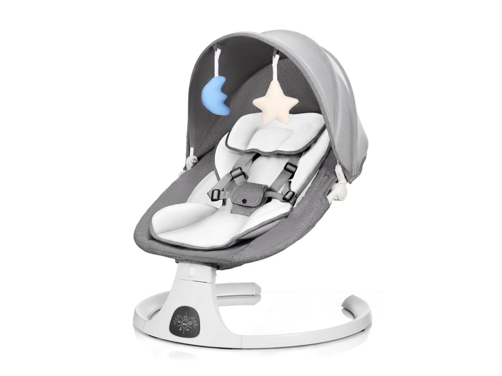 • Inteligentní automatické houpaní: Inteligentní senzor pohybu upravuje intenzitu houpání na základě pohybů dítěte a napodobuje houpání rodičů. 5 nastavitelných rychlostí houpání, 3 polohy sklopení, 3 nastavení časovače (8/15/30 min) pro hraní nebo krmení.