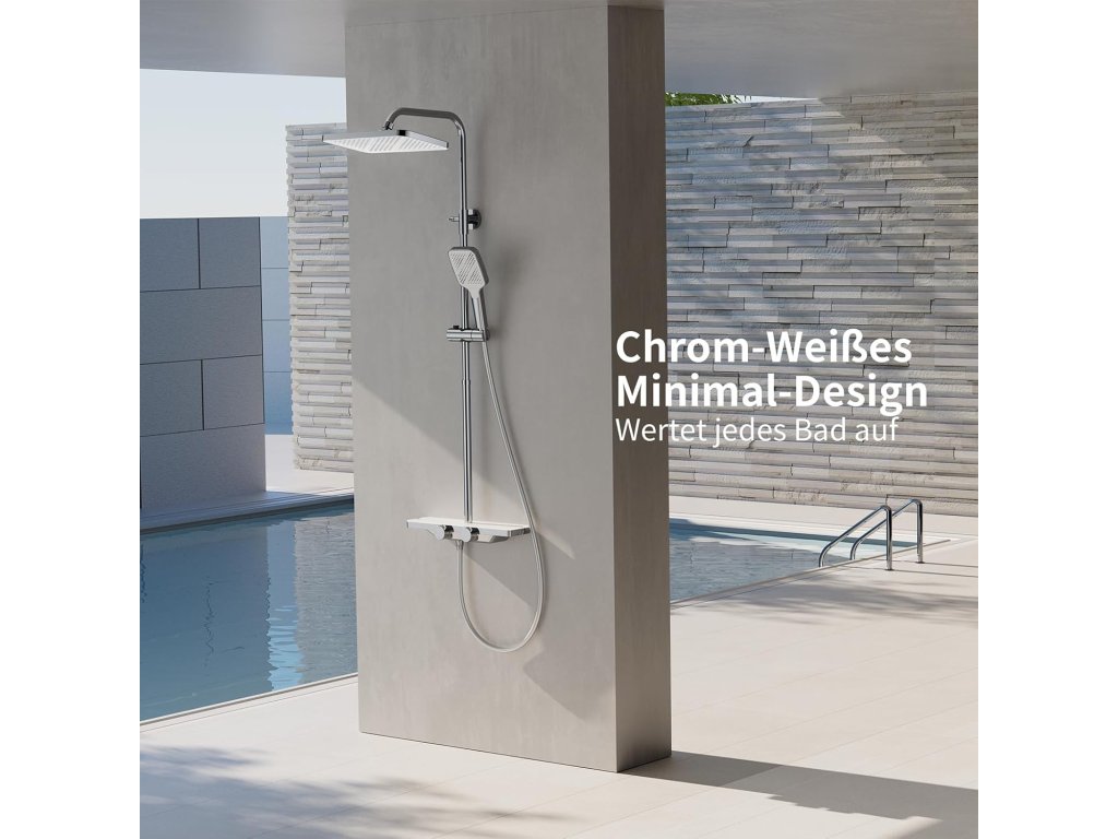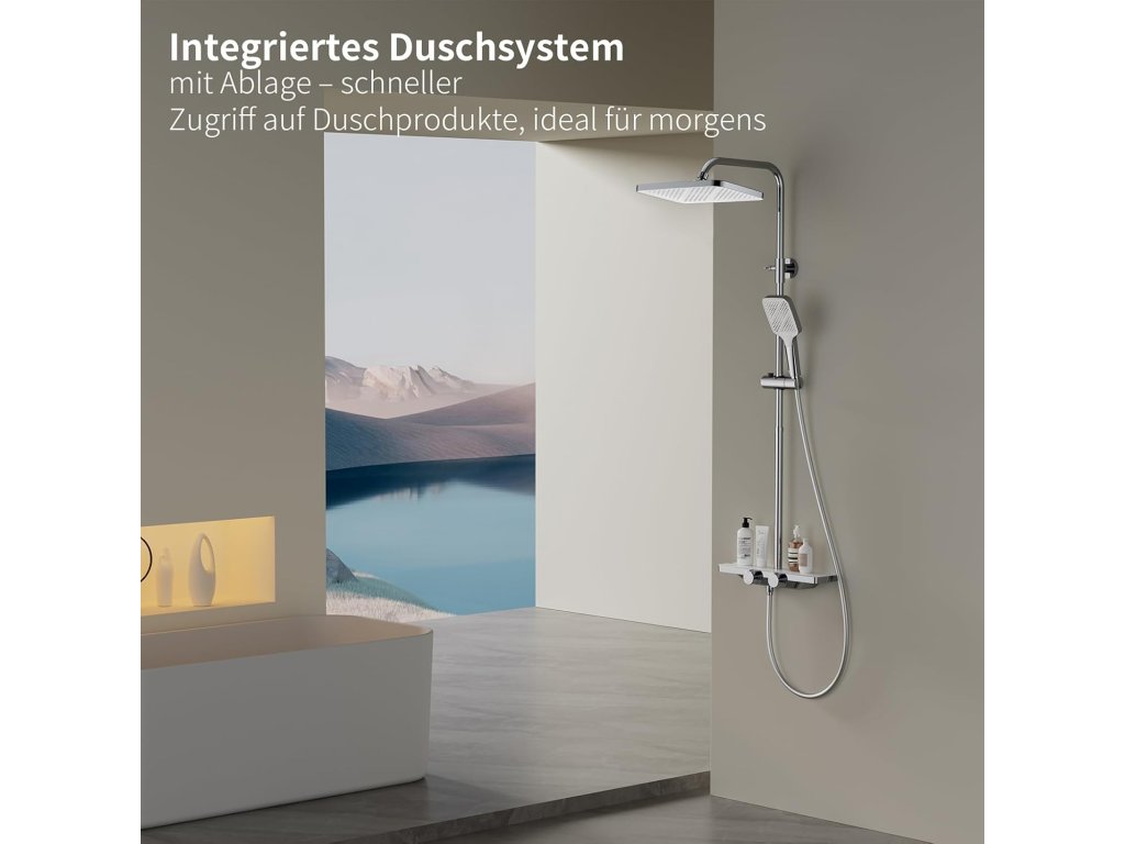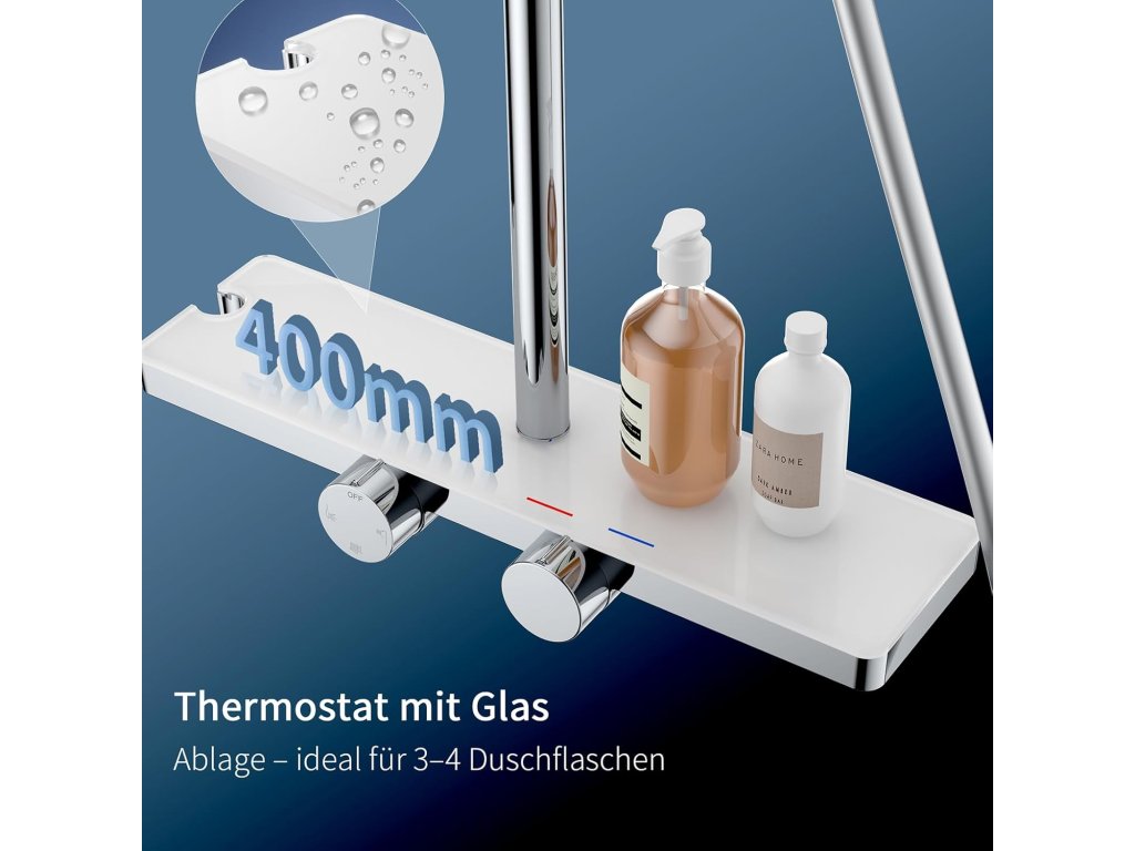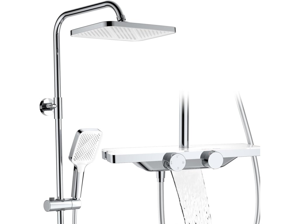 Prodám nový - v krabici zabalený sprchový systém HOMELODY. Sprchový systém je vybaven termostatem a chromovanou poličkou, kompletní sprchová baterie s ruční sprchou 30 cm, 3 druhy proudu a spodním výtokem, sprchová sada s dešťovou sprchou viz foto.