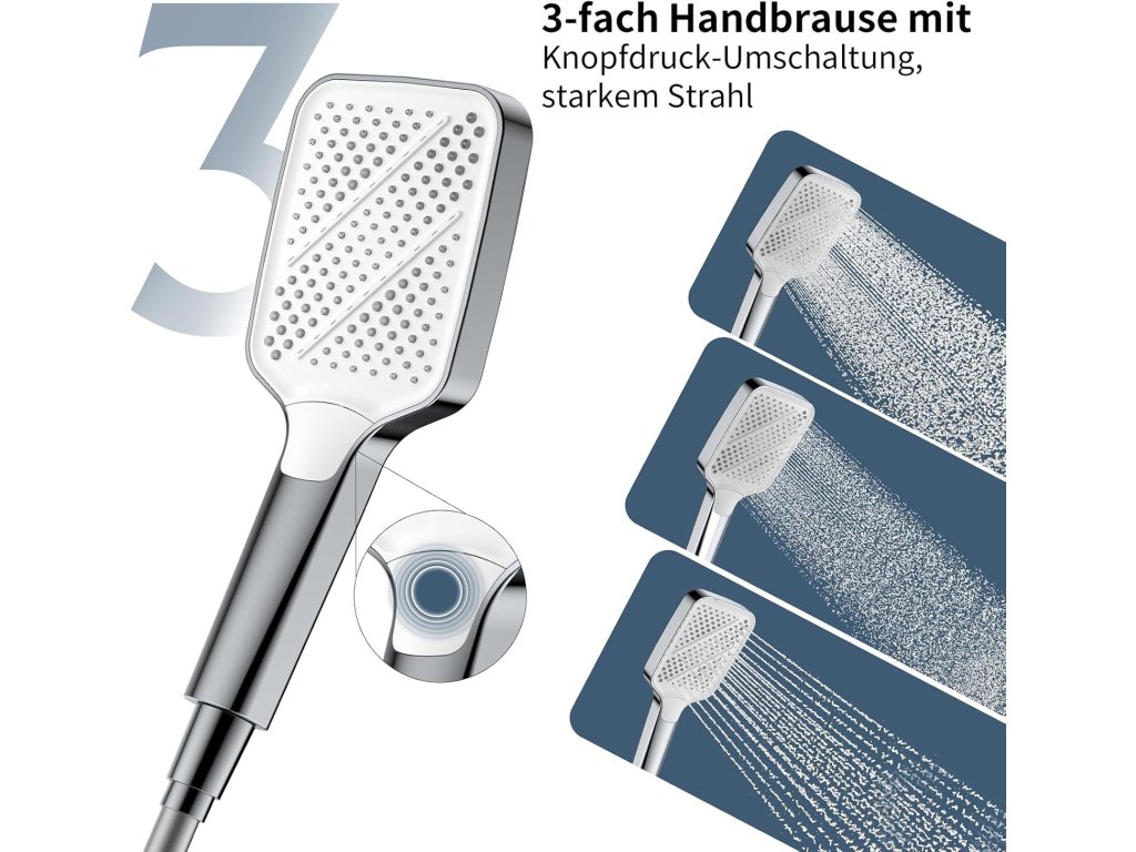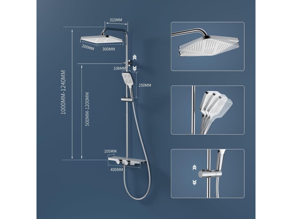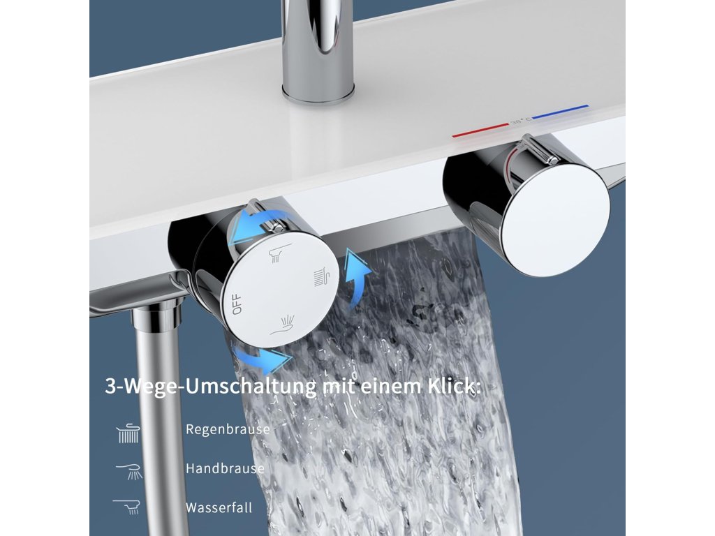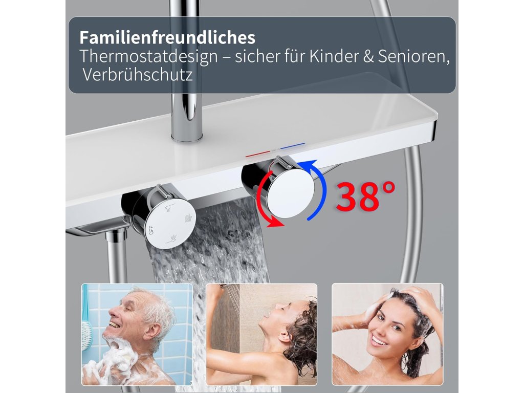 Prodám nový - v krabici zabalený sprchový systém HOMELODY. Sprchový systém je vybaven termostatem a chromovanou poličkou, kompletní sprchová baterie s ruční sprchou 30 cm, 3 druhy proudu a spodním výtokem, sprchová sada s dešťovou sprchou viz foto.
